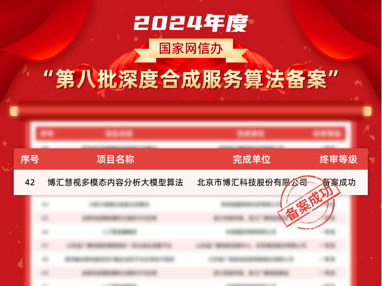 近日,博匯科技自主研發的「博匯慧視多模態內容分析大模型算法」成功通過國家網信辦深度合成服務算法備案,在算法的有效性、安全性和合規性等方面再次榮獲國家級權威認可。